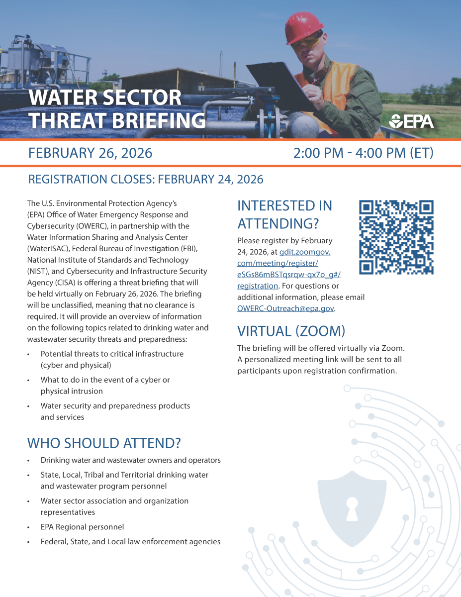 The U.S. Environmental Protection Agency’s (EPA) Office of Water Emergency Response and Cybersecurity (OWERC), in partnership with the Water Information Sharing and Analysis Center (WaterISAC), Federal Bureau of Investigation (FBI), National Institute of Standards and Technology (NIST), and Cybersecurity and Infrastructure Security Agency (CISA) is offering a threat briefing that will be held virtually on February 26, 2026. The briefing will be unclassified, meaning that no clearance is required. It will provide an overview of information on the following topics related to drinking water and wastewater security threats and preparedness: