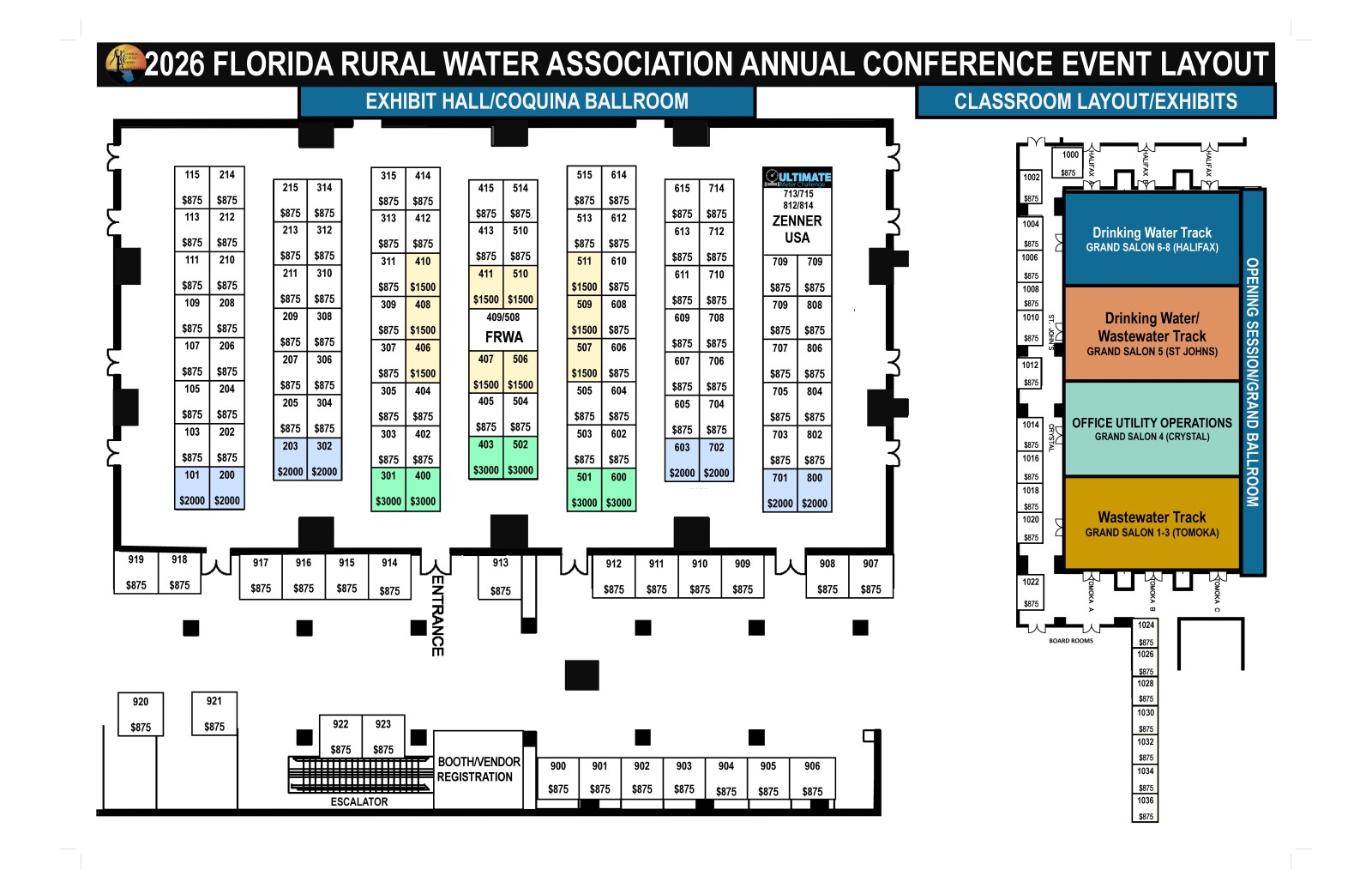 You must be a member of FRWA to purchase a booth for this year's Conference. A maximum of two booths per vendor. Booth prices include registration for two company attendees per booth, so if you plan on having a second attendee, don't forget to complete the information for them as well. If you need additional booth attendees beyond the 2 provided, they can be purchased for $425 per extra attendee. Please email finance@frwa.net with all attendee information and we will send an invoice with a link to pay. Registration includes all meals and activities.